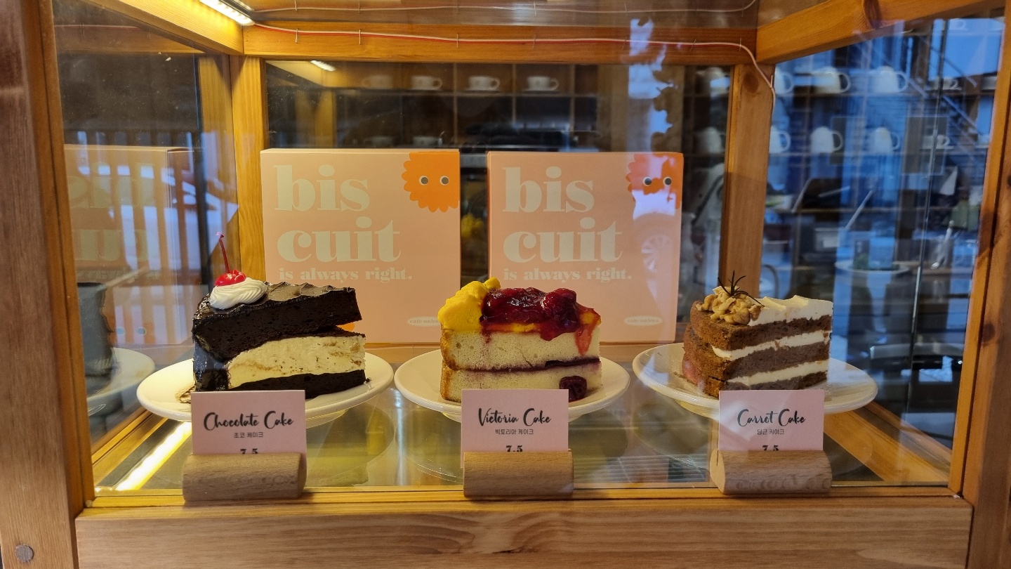 케이크도 준비가 되어 있습니다. 초코 케이크 7500원, 빅토리아 7500원, 당근 케이크 7500원입니다.