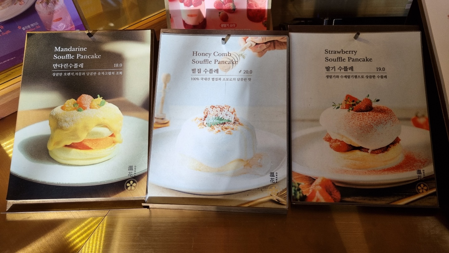 수플레 팬케이크는 4가지 종류가 있습니다. 플레인은 16000원, 딸기는 19000원, 벌집은 20000원, 만다린은 18000원. 아이스크림을 추가하면 3000원이 추가됩니다.