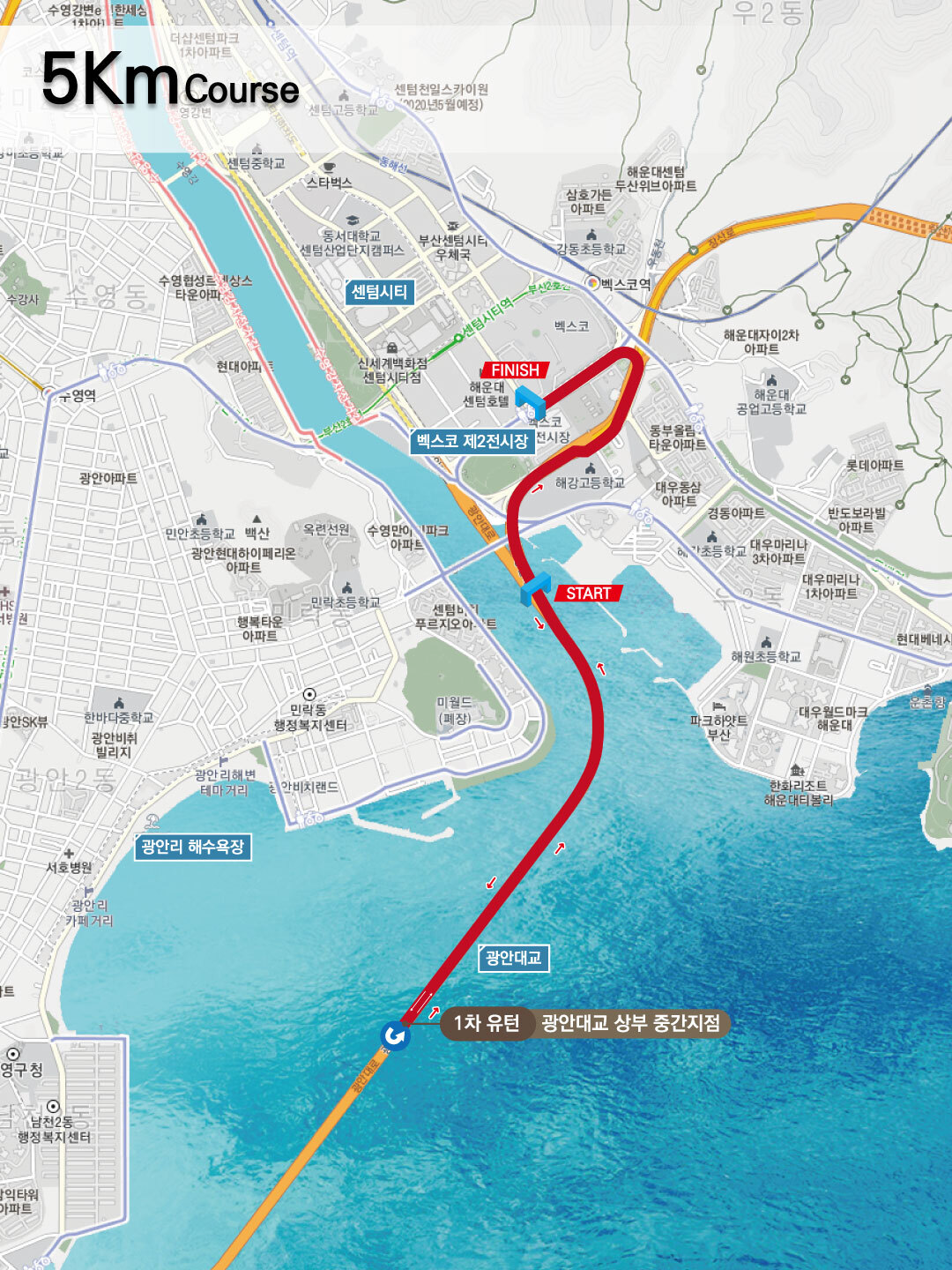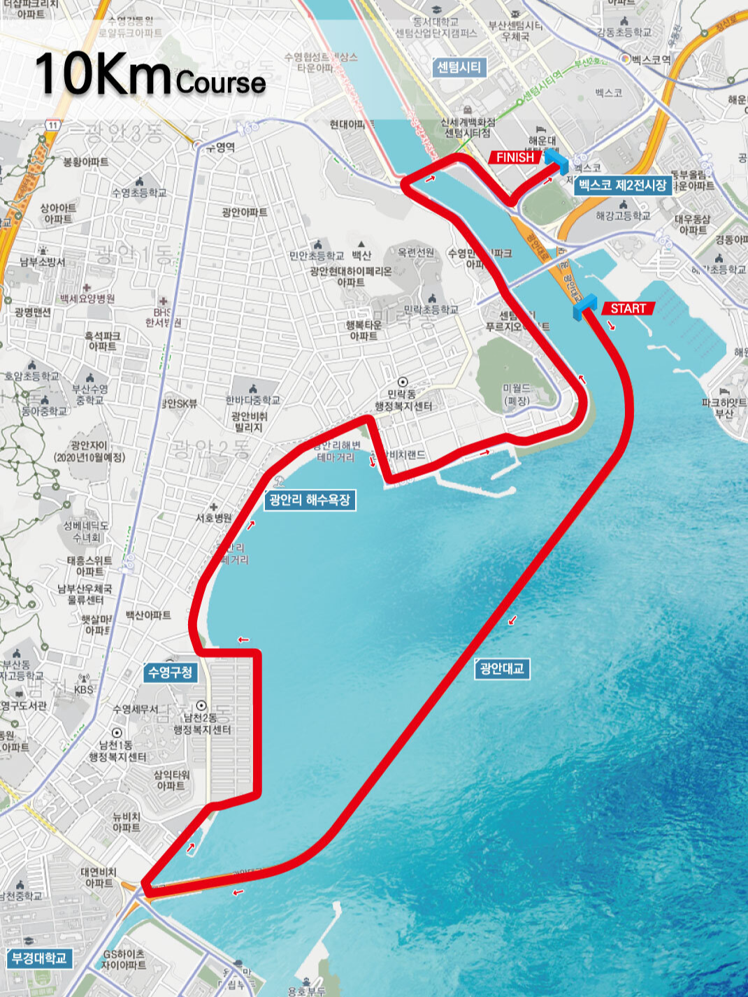 (10월 23일 일요일) 오프라인대회(10KM코스/5KM코스) 각 코스별로 출발지점은 벡스코로 모두 같습니다. 하지만 출발 방향이나 반환점 등이 달라서 코스별로 참가자들이 겹칠 일은 없을 것 같아요. 오프라인대회에 제한시간을 걸어둔 것도 이러한 이유도 있을 것 같습니다. 각 코스별로 참가자들이 겹치지 않게 하려고요.