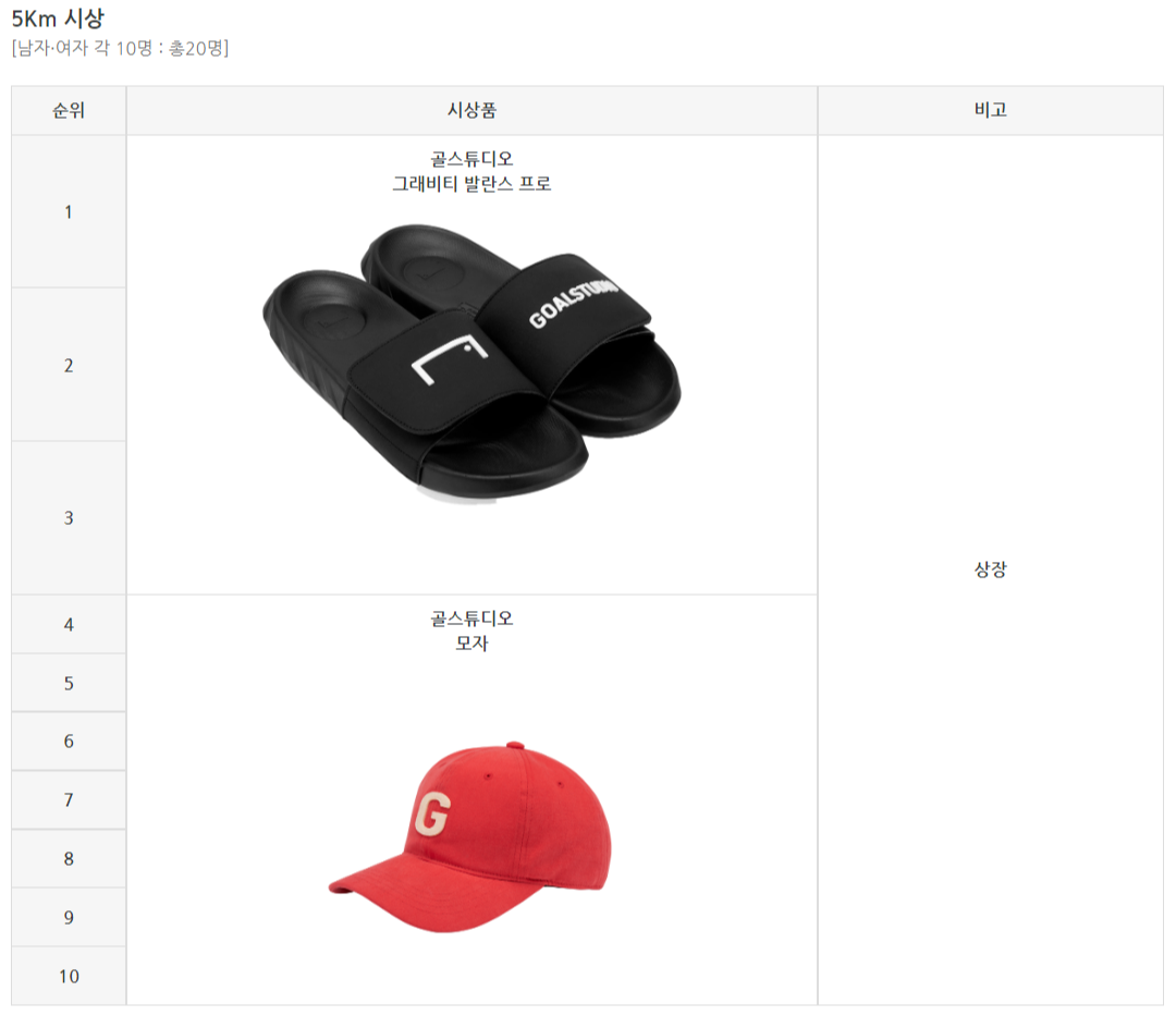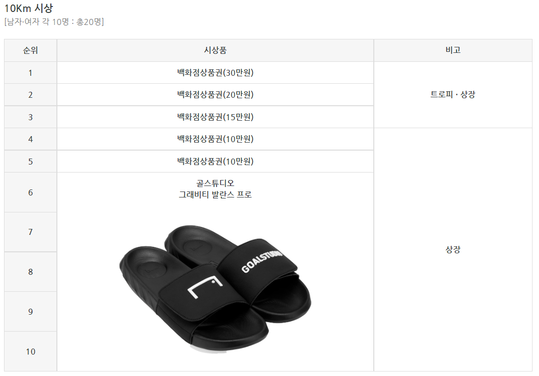 오프라인대회(10KM코스/5KM코스)에서는 각 종목별로 시강이 있습니다. 각 종목별로 남/녀 10명씩 총 40명에게 백화점상품권 및 골스튜디오 기념품이 시상된다고 합니다. 상금적인 측면에서는 조금 아쉽지만 많은 참가들에게 시상품을 준비했다는 측면에서 굉장히 준비를 많이 한 것으로 보입니다.