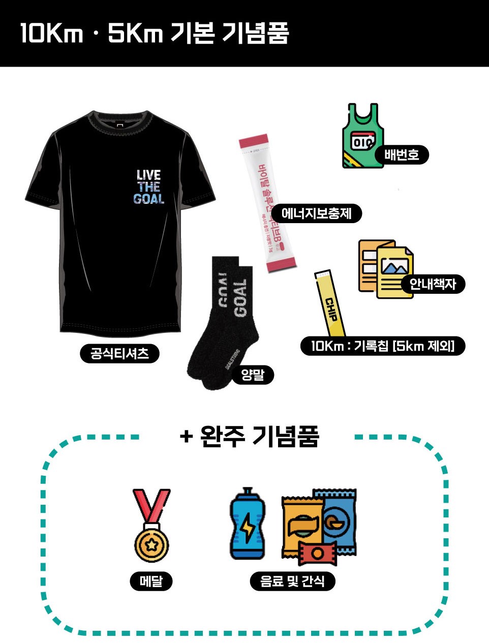 오프라인(10km코스/5km코스)과 온라인(풀코스/하프코스)대회 방법이나 종목별로 기본 기념품의 구성이 조금 다릅니다. 공통적으로 제공되는 기본 기념품은 골스튜디오 공식 티셔츠, 골스튜디오 스포츠 양말, 에너지보충제, 배번호, 안내책자, 메달입니다. 각 대회 방법이나 종목별로 10km 기록칩이라든지 메달, 음료, 간식, 모자 등이 다르네요. 기념품 구성에 따라 대회 방법이나 종목을 선택을 하시면 좋을 것 같아요. 골스튜디오 기념품에 초점을 맞추신다면 온라인 하프코스를 신청하시는 것이 가장 가성비가 좋을 것 같고 대회의 현장감에 초점을 맞추신다면 오프라인 10km코스가 가장 가성비가 좋을 것 같습니다. 그리고 39000원을 추가하여 결제를 하시면 골스튜디오 슬리퍼를 구입을 하실 수 있습니다. 각 기념품들의 상세 내용 보시고 신청하시기 바랍니다.