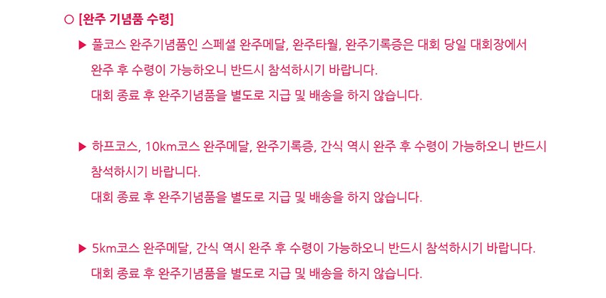 완주 기념품들은 대회 당일 대회 장소에서 완주 후에 직접 수령을 해야 한다고 합니다. 완주를 하신 다음 꼭 완주 기념품들을 수령해 가시기 바랍니다.