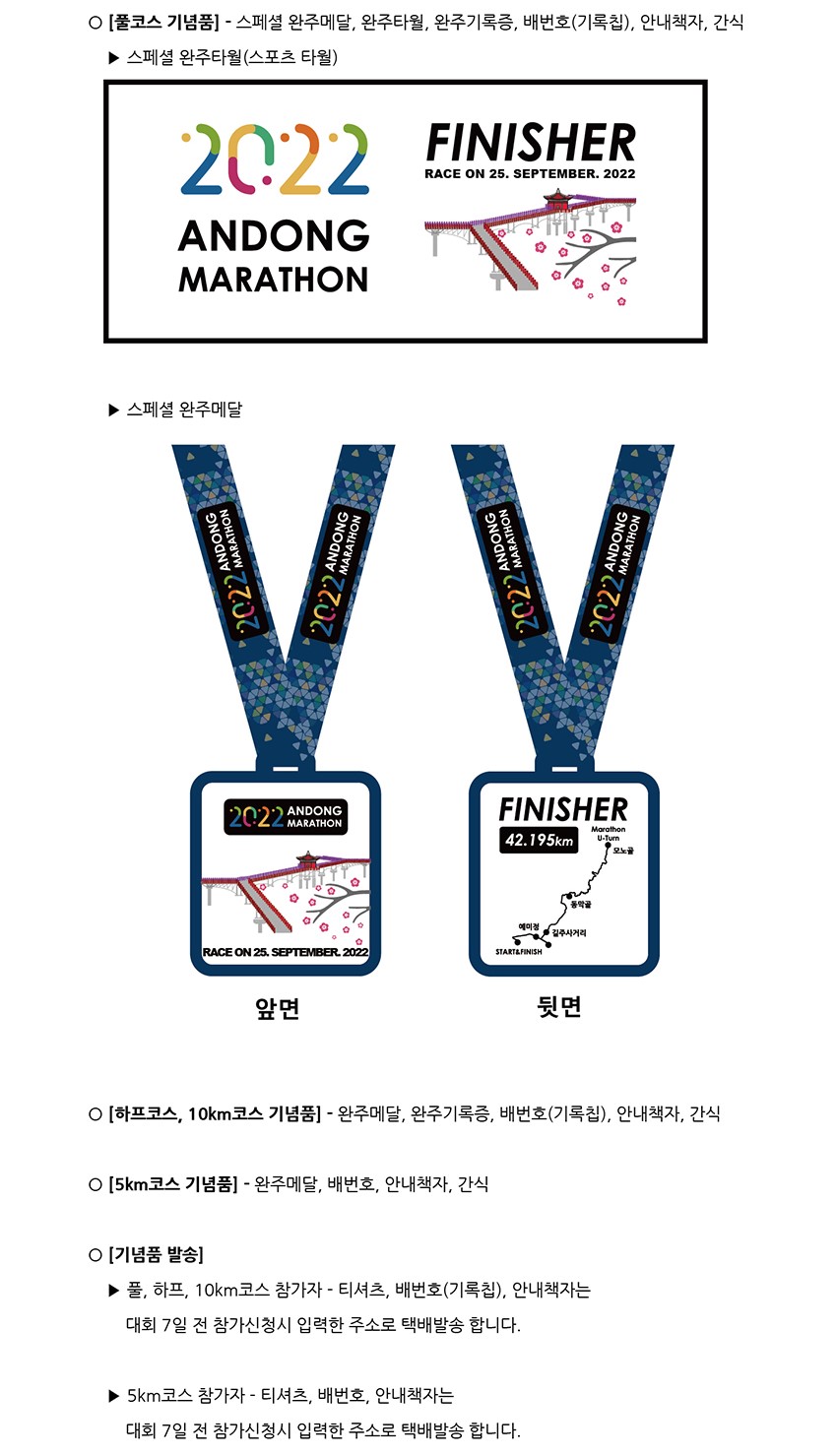 각 코스별 기념품은 구성이 조금씩 다릅니다. 풀코스는 완주타올 등이 추가된 구성입니다. 2022 안동마라톤대회의 완주를 축하하는 내용입니다. 또한 완주메달도 굉장히 화려하게 되어 있어요. 나머지 코스들은 평범한 완주메달에 안내책자에 거의 비슷한 구성입니다. 완주 기록증은 풀코스, 하프코스, 10km 코스를 완주하신 분들께만 지급됩니다.